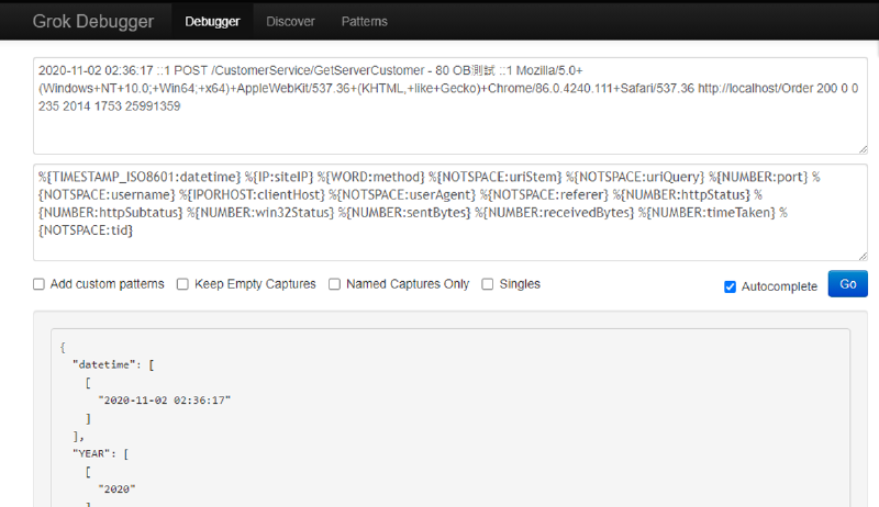 在filter這個部分會常用到的是grok表達語法,格式是%{屬性:自訂切割後屬性名稱},可以透過grokdebug這個線上工具驗證語法,以上面的設定為例子,就是透過 IIS LOG 的訊息,撰寫對應的 grok 語法去切割我們所需要的資料,有興趣的人可以去網站試試看
