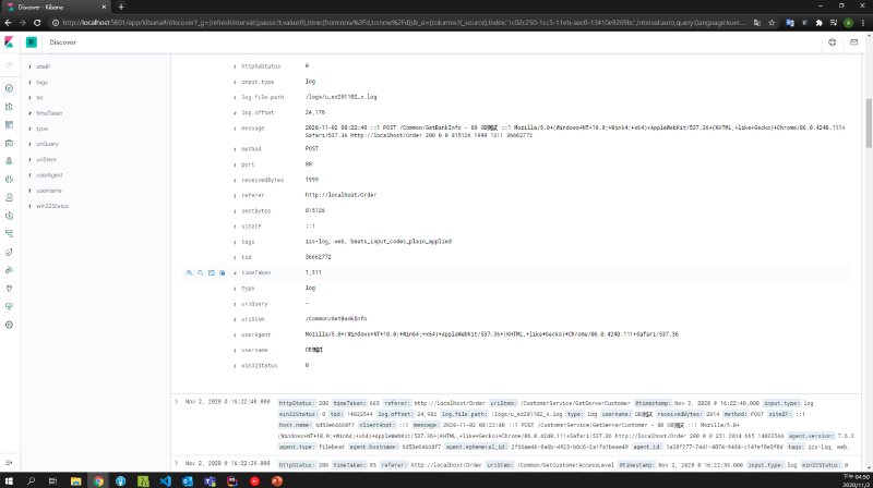 2020-11-02 02:36:17 ::1 POST /CustomerService/GetServerCustomer - 80 OB測試 ::1 Mozilla/5.0+(Windows+NT+10.0;+Win64;+x64)+AppleWebKit/537.36+(KHTML,+like+Gecko)+Chrome/86.0.4240.111+Safari/537.36 http://localhost/Order 200 0 0 235 2014 1753 25991359由於將 filebeat 設定標籤為iis-log、web,所以在 filter 這邊就可以透過下列的判斷式處理