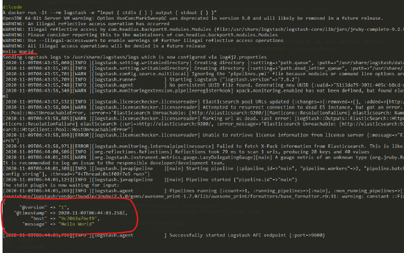 docker run -it --rm logstash -e "input { stdin { } } output { stdout { } }"輸入的Hello World之後可以看到螢幕上輸出的結果