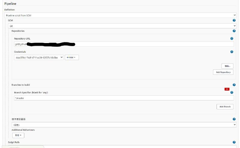 選擇Pipeline script from SCM,並設定好Repo網址