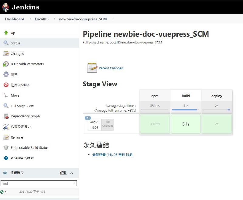 實際上 build 完畢之後還有 deploy 的部分,在這邊因為是我 local Jenkins Deploy to local Folder , 所以我直接用 node.js 寫個拷貝資料的 script就完事,如果是要發布到其他空間,可以參考VuePress 官方文件:部署