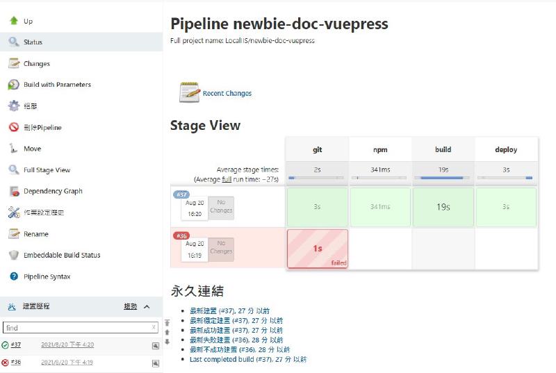 這是成功案例,在這之前我是先寫pipeline script去測試,測試成功才把取得SOURCE的那部分移除,然後加到Repo,可以看到失敗了37次…