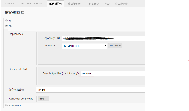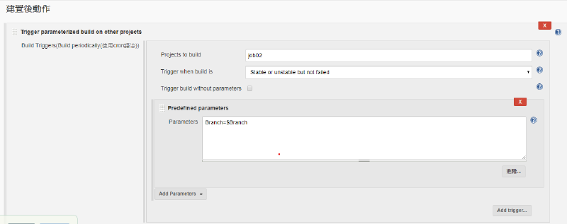 第一個 Job 我們假設叫做【job01】;第二個 Job 我們把它叫做【job02】;這兩個專案都透過參數化建置與 Git Parameter 來控制檔案來源為哪一個 Branch,這邊先定義變數名稱為 Branch