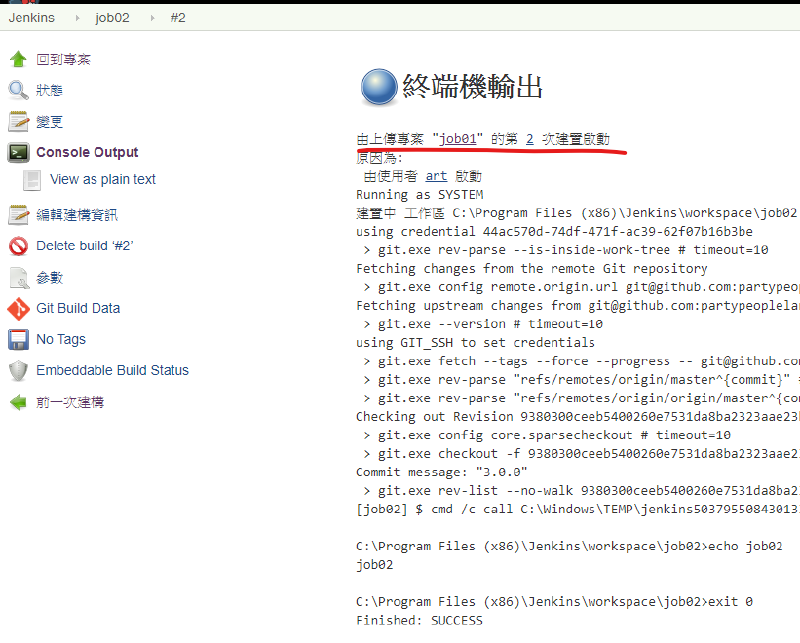 透過上面的方式,Job02 被觸發的原因是因為 Job01 我們有設定建置後動作,觸發其他專案的參數化建置,其實並不是上下游專案的設定