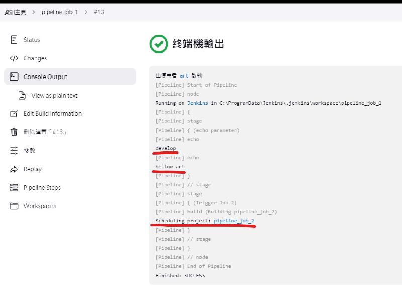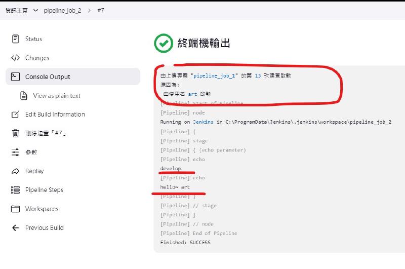 執行一下 pipeline,看看他有沒有正確傳遞參數跟觸發下一個任務