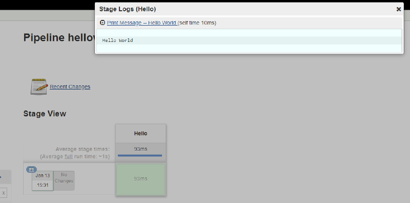 透過最簡單的 hello world 範例來認識 pipeline,在下面的指令共有一個 stage,這個 stage 的動作就只有一個,顯示 hello world