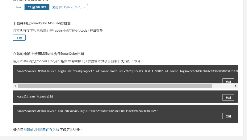 SonarScanner.MSBuild.exe begin /k:"taskproject" /d:sonar.host.url="http://127.0.0.1:9000" /d:sonar.login="9ef26bd5d79f1893a0bfe91d572a04a04b12908a" /d:sonar.cs.dotcover.reportsPaths="report.html"