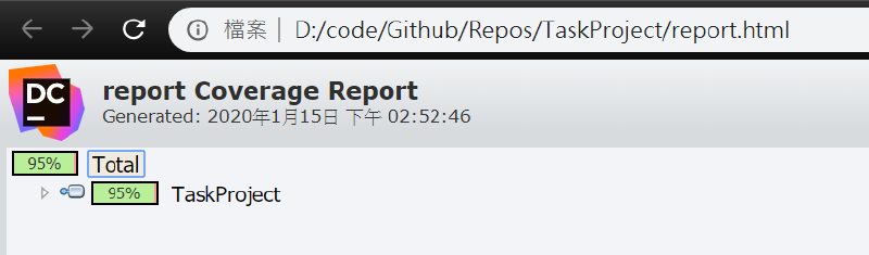 dotCover cover /TargetExecutable="C:\Program Files (x86)\Microsoft Visual Studio\2019\Community\Common7\IDE\CommonExtensions\Microsoft\TestWindow\vstest.console.exe" /TargetArguments="TaskProjectTests.dll" /TargetWorkingDir="TaskProjectTests\bin\debug" /Output="report.html" /ReportType="HTML"產生完畢報告之後,可以透過瀏覽器觀看