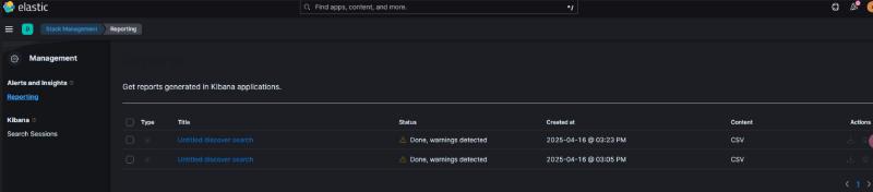 進入 Stack Management > Reporting,可看到剛剛產生的 CSV 報表,點右側 Icon 可下載: