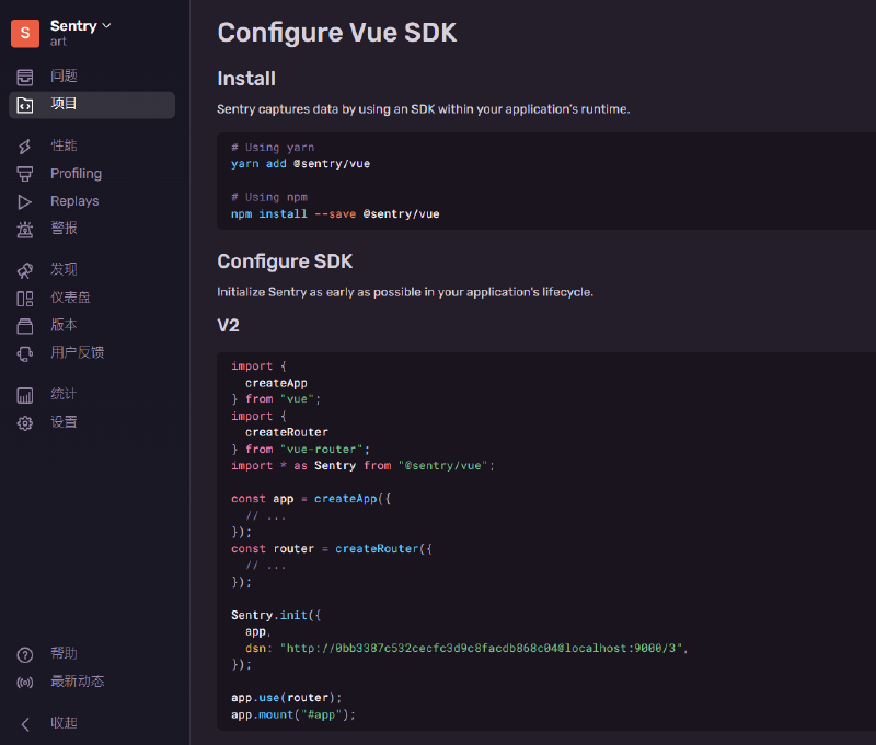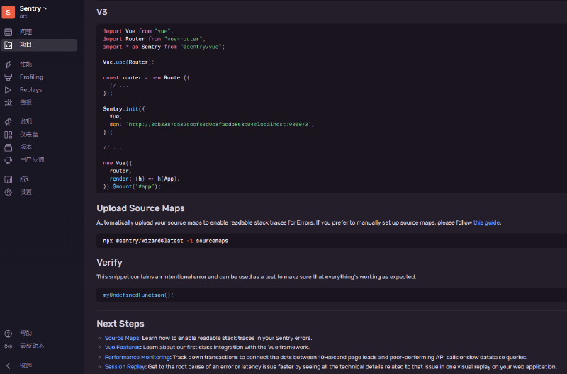 這邊用 Vue3 做示範,讓我很驚豔的是,在 sentry 頁面也有互動的方式詢問你要怎麼使用,並給予對應的程式碼,這樣的體驗真的很棒,