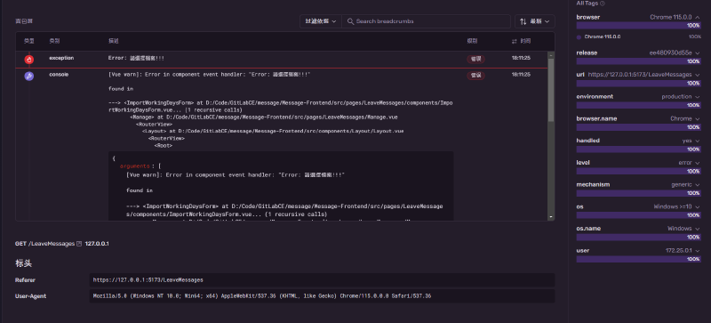 為了測試一下 sentry 在捕捉錯誤之後的效果,我照著步驟安裝前端套件並設定後,故意做一個 throw Error 的動作,看看捕捉的錯誤會長怎樣