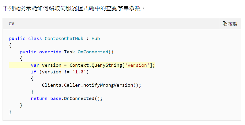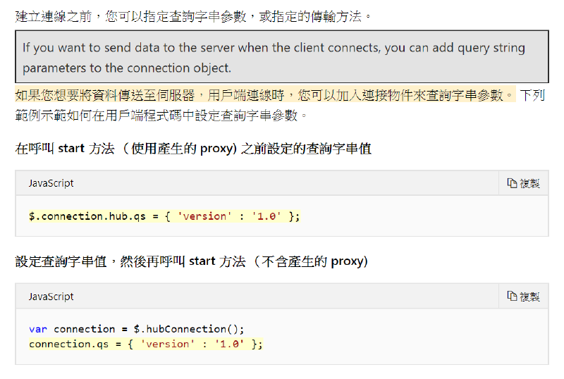 如此一來就可以透過 MVC 後端讀取使用者資訊,並在 Web 頁面與 SignalR 連線之前,將資料透過下列的方式塞入 QueryString,並可由後端取得資訊,應可利用 QueryString 來區分使用者的組別,然後在送出訊息的時候判斷組別,並在該組別發言