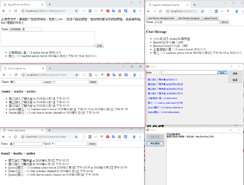}比較重要的事情是,因為單一用戶群組是在某個 Hub 底下所建立的,如果在 Invoke 的時候密語的對象不在同一個 Hub,訊息是沒辦法傳給對方的,解決辦法其實就是讓所有人都會加入同一個 Hub,也就是 Notice,當使用密語功能的時候,就一律透過 NoticeHub 來傳遞即可。
