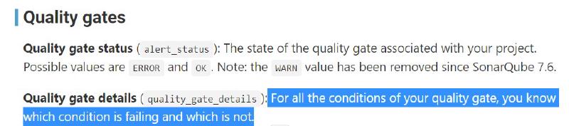 def detailJson = qualityGateDetails.replace("\\\"", "\"")簡單好用 - 迴圈取得條件 KEY 與內容,並透過 stringbuilder 組字串,缺點就是他KEY有些沒有很直覺,提供的也是OK不OK,細節還是要再去網站看,不過作為通知應該很夠了
